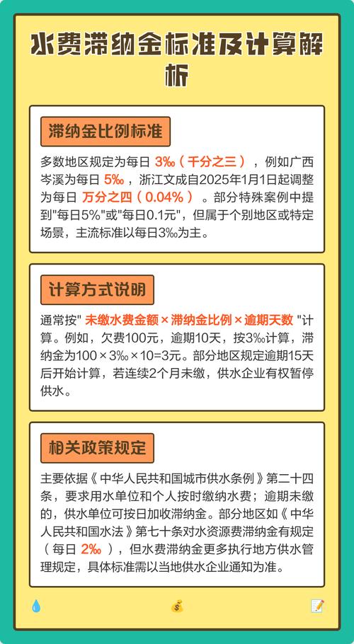 水费滞纳金法律如何规定上限与减免? 水费滞纳金的法律规定并非由一部单一的全国性法律直接规定,而是由地方性法规和政府规章来具体明确,其核心法律依据是《中华人民共和国民法典》中关于“违约责任”的原则性规定,以下是详细的分析和说明: 核心法律依据《中华人民共和国民法典》第五百八十五条“当事人一方不履行合同义务或者履行合同义务不符合约定的,应...