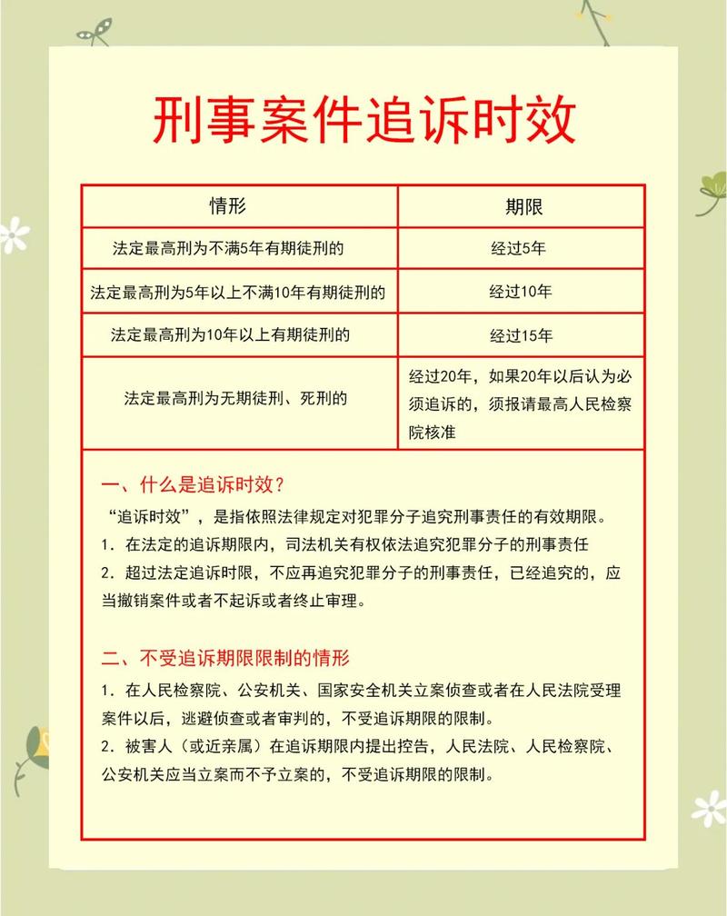中国法律追诉期具体是几年? 罪行越严重,追诉期就越长,以下是《中华人民共和国刑法》中关于追诉时效的具体规定,以及一些重要的例外情况, 核心规定:根据法定最高刑划分根据《刑法》第八十七条,追诉时效的期限分为以下四档:法定最高刑为不满五年有期徒刑的:追诉时效期限:5年法定最高刑为五年以上不满十年有期徒刑的:追诉时效期限:10年法定...