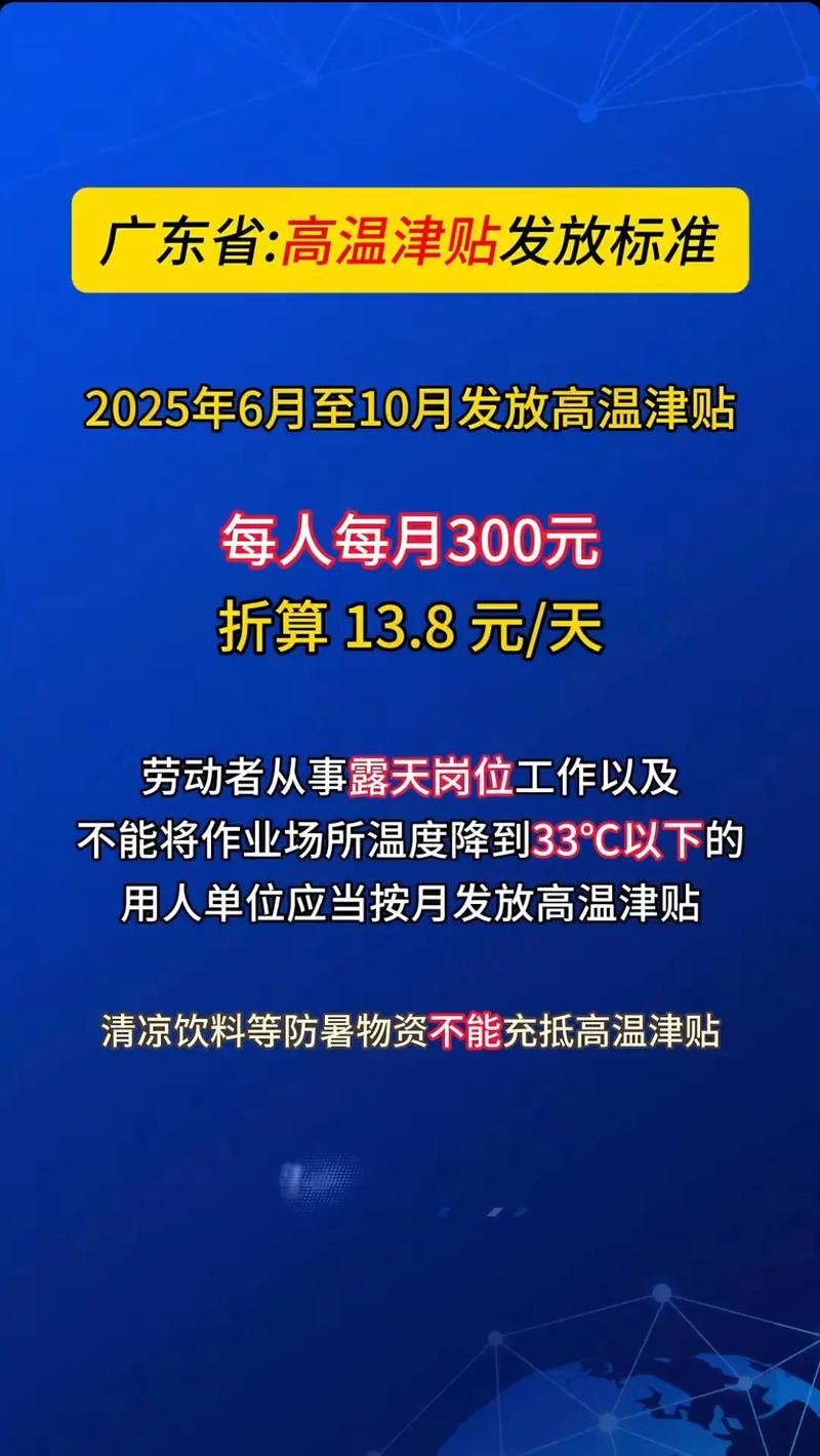 广东高温补贴标准与发放规定是什么? 广东省的高温补贴政策主要依据国家和地方的相关法律法规,核心是保障劳动者在夏季高温天气下的身体健康和合法权益,核心法律依据广东省的高温补贴政策主要基于以下法律法规:国家层面:《防暑降温措施管理办法》(安监总安健〔2012〕89号):这是最核心的全国性规章,对高温作业、高温天气劳动保护、高温津贴等做出了...