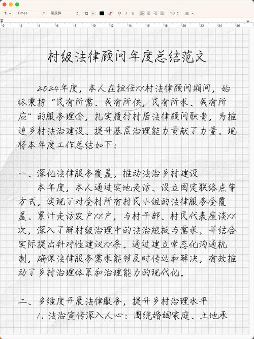 村法律顾问工作成效如何? 2023年度XX村法律顾问工作总结尊敬的XX司法局领导、XX村委会全体成员、各位村民朋友:大家好!根据上级司法行政部门的统一部署和安排,我(XXX律师事务所XXX律师)自2023年起,担任XX村的法律顾问,在过去的一年里,我始终秉持“服务基层、依法治村、便民惠民”的宗旨,紧密围绕乡村振兴战略,积极履...