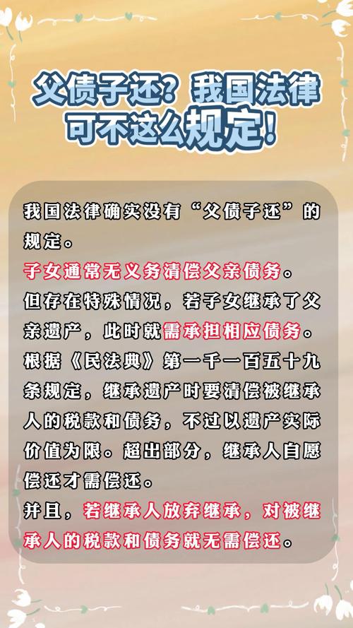 父债子还,法律真有此规定吗? 这是一个非常普遍且重要的法律问题,答案是:没有“父债子还”这种普遍的法律义务,子女在法律上没有必须偿还父亲债务的天然义务,但这并不意味着子女在任何情况下都与父亲的债务无关,具体情况需要分多种情况来讨论,核心法律原则:继承法与限定继承中国法律处理这类问题的核心是《中华人民共和国民法典》中的继承制度,限...