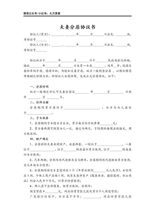 分居协议书是合同还是法律特殊规定? 分居协议书是一份具有民事合同性质的协议,它对夫妻双方在分居期间的财产、债务、子女抚养、探望等问题做出约定,对签订协议的夫妻双方具有法律约束力,但它本身不产生解除婚姻关系的法律效力,下面我们从几个核心方面来深入理解其法律性质: 核心法律性质:民事合同分居协议书最根本的法律属性是民事合同(或称为“契约”...