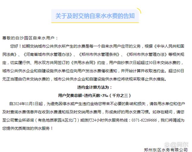 水费违约金的法律规定具体是多少? 水费违约金的法律规定并非由国家一部统一的《水费违约金法》来规定,而是由一系列法律法规、地方性法规和供水合同共同构成的,其核心目的是为了保障供水企业的合法权益,督促用户按时缴费,维护正常的供水秩序,以下是关于水费违约金法律规定的核心要点: 法律依据水费违约金的法律依据主要来自以下几个方面:《中华人民共...