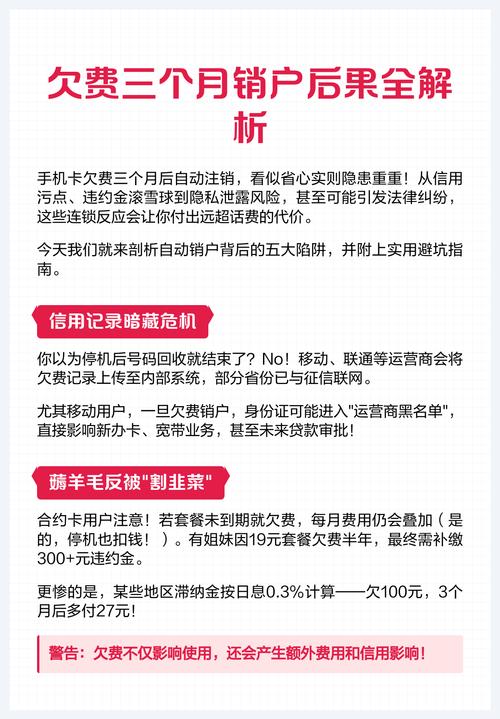 欠话费不交,法律后果有多严重? 欠话费不交,首先会面临一系列运营商内部的催收措施,如果长期拖欠且金额较大,则可能升级为法律诉讼,并最终影响到您的个人信用记录,以下是不同阶段可能发生的后果,由轻到重排列:第一阶段:运营商内部催收(非法律手段)这是最常见的第一步,通常在您逾期后的几天到几个月内发生,停机(或限制服务)描述:这是最直接的...