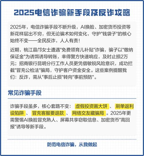 2025诈骗新套路有哪些?如何快速识别防范? 2017年最新诈骗手段大盘点2017年的诈骗呈现出精准化、技术化、集团化的特点,骗子不再广撒网,而是通过非法获取的个人信息,进行“量身定制”的诈骗, “精准”诈骗:信息泄露是源头2017年最显著的特征是,骗子能准确说出你的姓名、身份证号、电话,甚至家庭住址和购物记录,这背后是大规模的个人信息泄露事件...