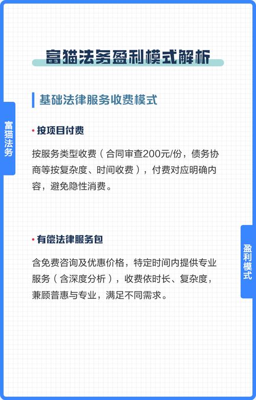 法律咨询公司盈利模式 核心盈利模式:传统法律服务收费这是法律咨询公司的基石,至今仍是绝大多数律所和咨询公司的主要收入来源,按时计费模式描述:这是最经典、最普遍的模式,客户为律师或咨询顾问花费的时间支付费用,费用通常根据律师的资历、专业领域和所在地区确定,适用场景:诉讼、仲裁、复杂的并购交易、法律尽职调查、日常法律顾问服务...