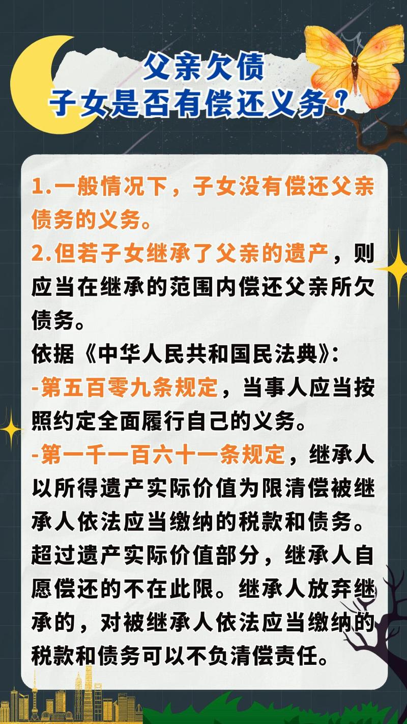 父债子还,法律上到底有没有义务? 这是一个非常常见且重要的问题,核心原则是:儿子在法律上没有义务替父亲还债,除非存在以下几种特殊情况,下面我将为您详细解释这个原则以及那几种例外情况,核心原则:父债子还是传统观念,非法律义务在现代社会法律体系下,个人债务个人承担是基本原则,父亲作为独立的民事主体,他所欠下的债务属于他的个人债务,同样,...
