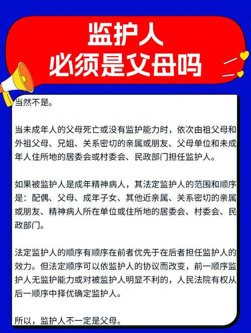监护人法律规定具体有哪些? 核心概念:什么是监护人?监护人是指对无民事行为能力人(如不满8周岁的未成年人)或者限制民事行为能力人(如8周岁以上未满18周岁的未成年人,以及不能完全辨认自己行为的成年人)的人身、财产及其他合法权益负有监督、管理和保护责任的人或组织,监护人就像是“法定代理人”,被监护人的很多行为都需要通过监护人来完...