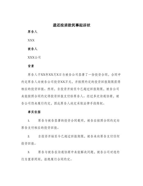 - 提出具体的返还要求:返还投资款本金XX元,并支付违约金/利息XX元(如有)。