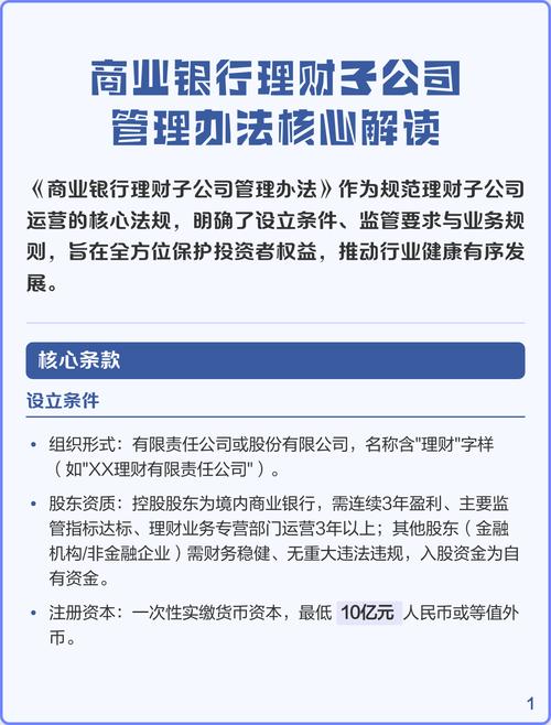 - 设立主体:只有符合条件的商业银行才能设立理财子公司,通常要求银行满足资本充足、风险管理和内部控制良好等条件。