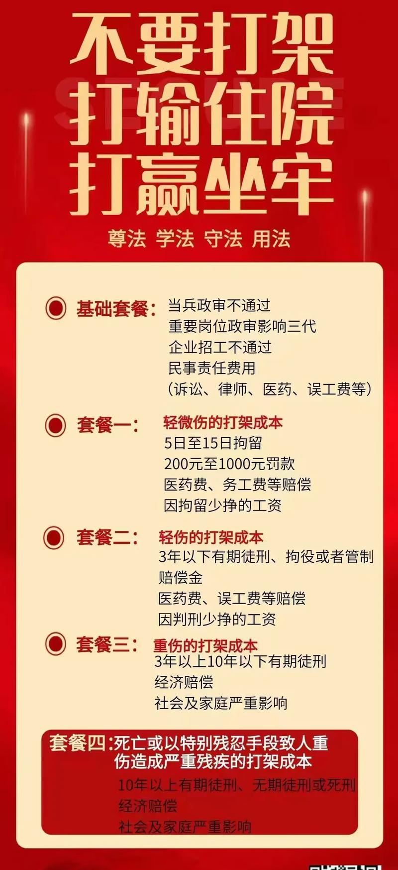 - 故意伤害罪:打架斗殴,造成他人轻伤以上后果的,将面临刑事处罚。