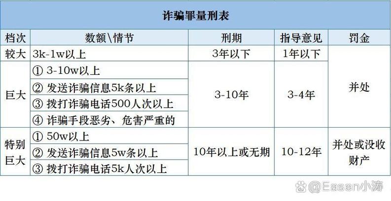 - 单位犯罪:单位直接负责的主管人员和其他直接责任人员,以单位名义实施诈骗,诈骗所得归单位所有,数额在5万元至20万元以上的,应当依照刑法第二百六十六条的规定以诈骗罪追究刑事责任,单位诈骗数额在50万元以上的,应当依照刑法第一百五十一条的规定以诈骗罪追究刑事责任(对应个人“数额特别巨大”的量刑档次)。