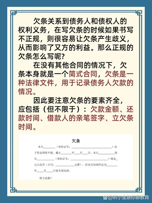 - 咨询专业律师: 如果涉及金额较大或情况复杂,建议在出具或签署欠条前咨询专业律师,以规避风险,如果发生纠纷,更要及时寻求法律帮助。 完备、要素齐全、资金交付清晰的民间欠条,是您合法债权的坚实“护身符”。