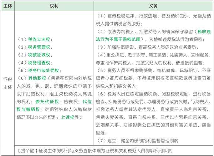 - 纳税主体是义务的承担者,包括纳税人、扣缴义务人等不同角色,需要根据具体税种和法律规定来区分。