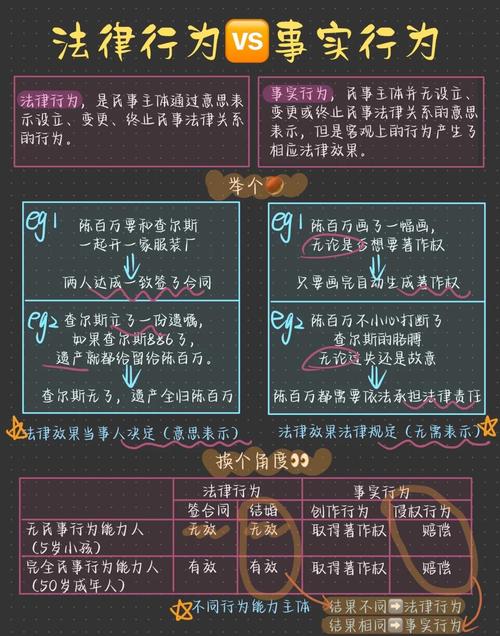 - 法律行为:指以意思表示为要素,旨在设立、变更或消灭民事法律关系的行为,签订合同、立遗嘱、结婚、放弃继承权等,它的核心是“当事人的意志”。