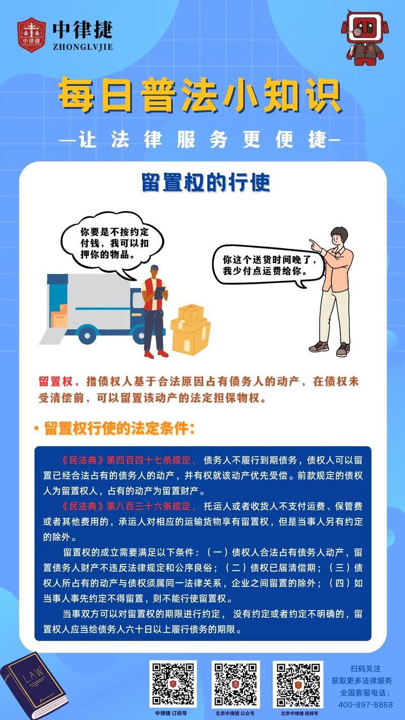 - 常见场景: 加工、保管、运输等合同中,债权人可以留置与这些服务相关的物品。