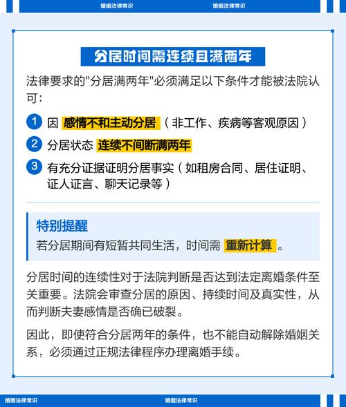 - 诉讼离婚:“分居两年”是法院判决离婚的一个重要依据,但它不是唯一依据,即使没有分居两年,但如果法院能够认定存在“重婚、家暴、赌博屡教不改”等其他导致感情破裂的情形,也可以判决离婚,反之,如果分居两年,但一方有强烈的和好意愿,提供了感情尚未破裂的证据,法院也可能不准予离婚。