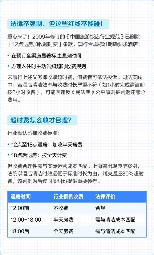 (图片来源网络,侵删)- 公平交易原则:该法规定消费者享有公平交易的权利,如果酒店设置的退房时间(如12:00)与普遍的行业惯例(如14:00)相差过大,且没有提供相应的解释或补偿,可能会被认为是不公平的格式条款。