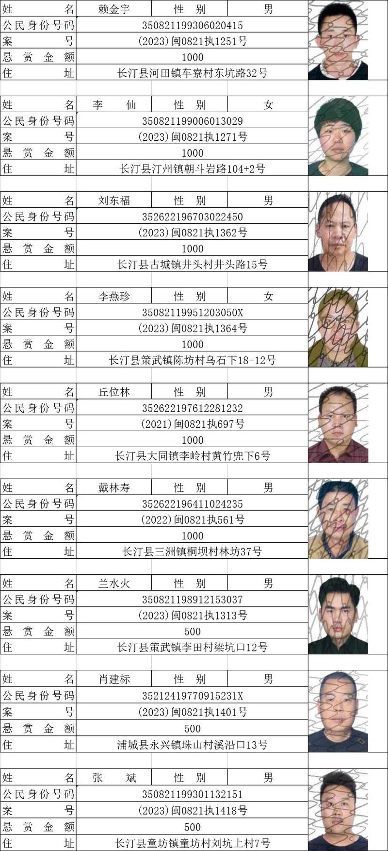 - 在逃人员姓名、照片、身份证号
