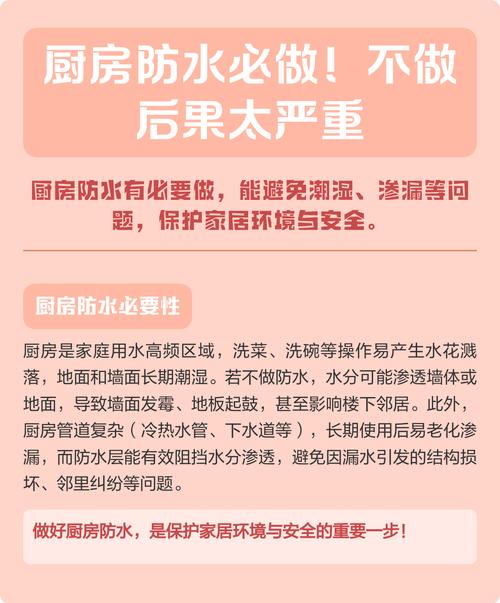 - 法律解读:虽然法律没有明文规定“装修必须做防水”,但它规定了“不得损害他人合法权益”的原则,厨房不做防水,导致自家水渗漏到楼下邻居家中,侵害了邻居的财产权(如天花板、家具、装修等),届时,楼下邻居有权要求您停止侵害、排除妨碍、恢复原状、赔偿损失,您将承担全部的维修费用和楼下邻居的财产损失,甚至可能引发邻里纠纷和法律诉讼。