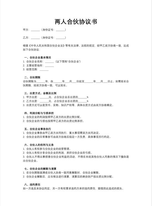 - 签订一份完善的合伙协议:这是预防纠纷的根本,协议应尽可能详细地约定:出资方式与期限、利润分配与亏损分担、事务执行方式与决策程序、入伙与退伙的条件与程序、竞业禁止、保密义务、违约责任、争议解决方式等。