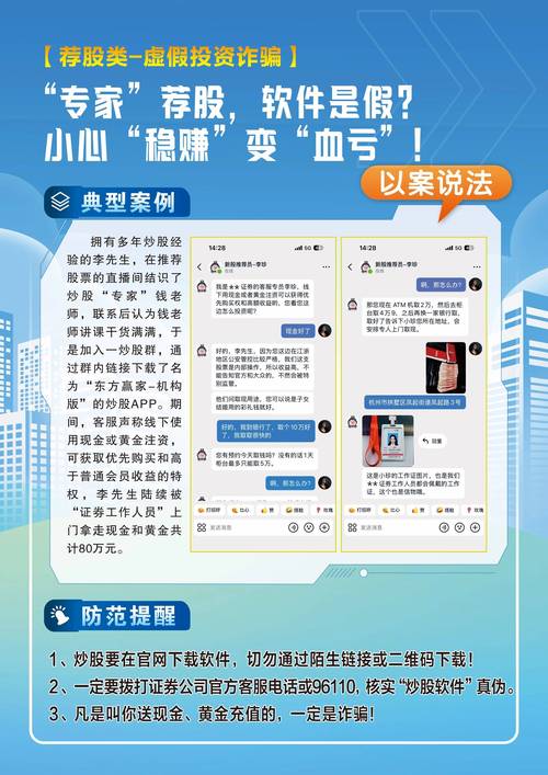 - 虚假投资理财:以“高回报”、“稳赚不赔”为诱饵,诱导受害者在虚假平台投资,骗取资金,对此类骗局的组织者、推广者、平台运营者,将严惩不贷。