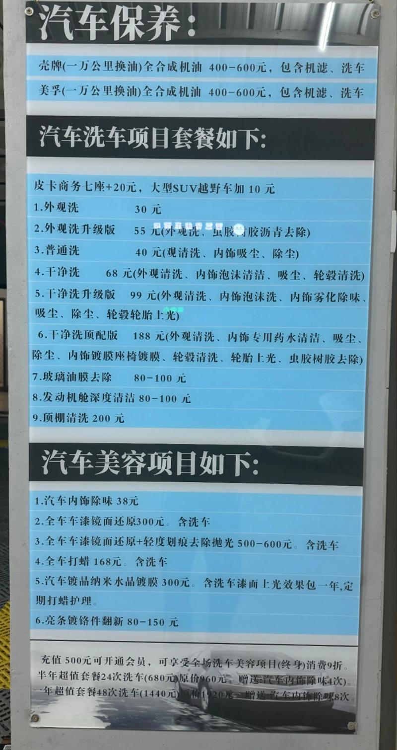 - 模式: 精洗、深度美容、漆面护理(镀晶、隐形车衣)、内饰翻新、甚至小型改装。