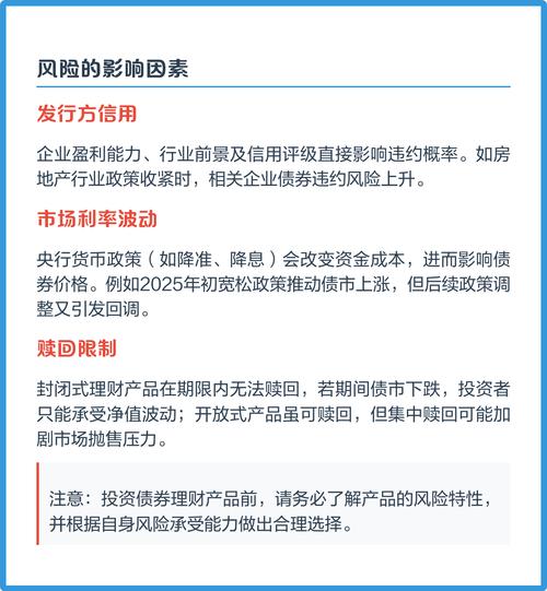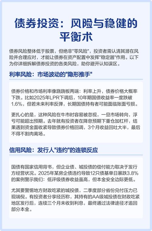- 利率风险:这是债券最主要的“敌人”,当市场利率上升时,已发行的、利率较低的债券价格会下跌,您想卖出债券时,会发现只能折价出售,造成资本损失。