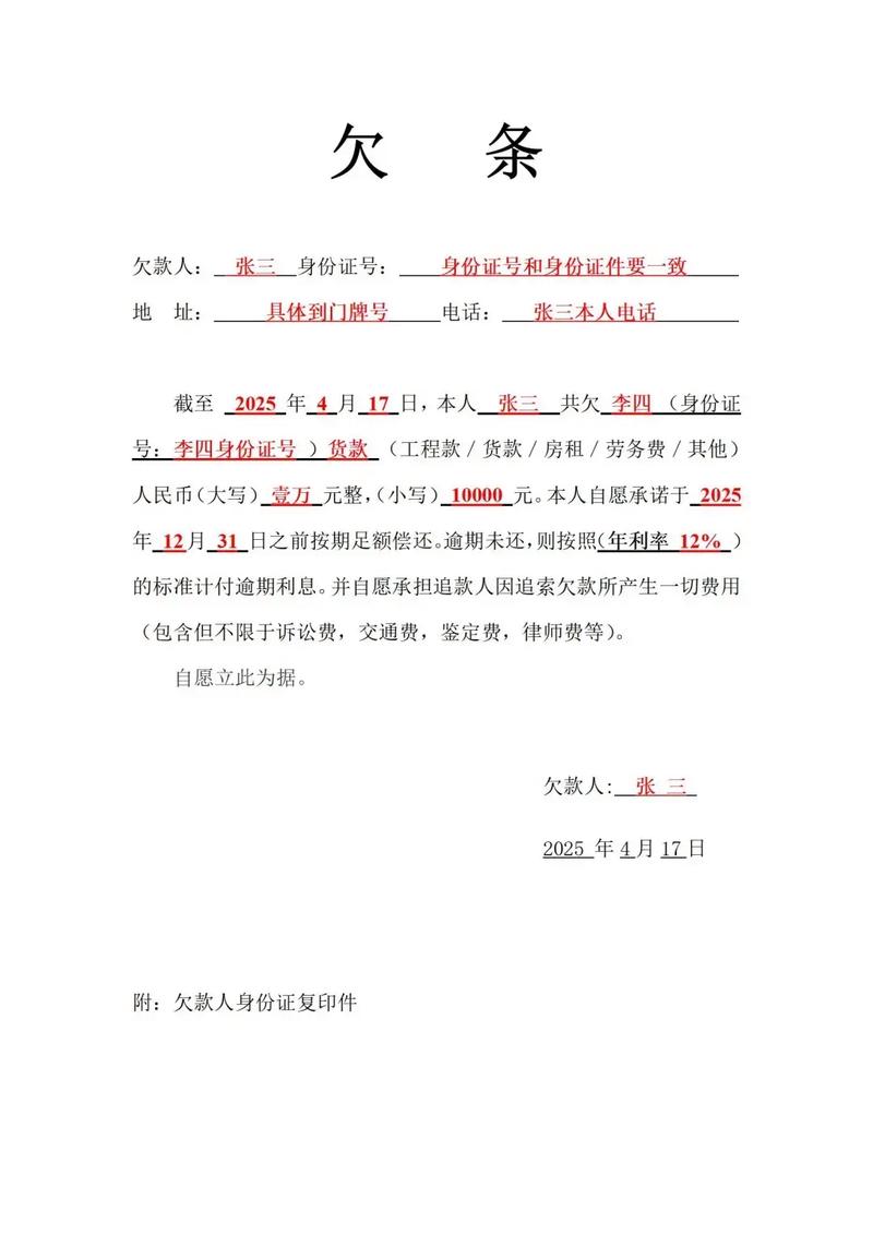 - 在借条中附上出借人的银行账户信息(户名、开户行、账号),确保还款路径清晰可查。