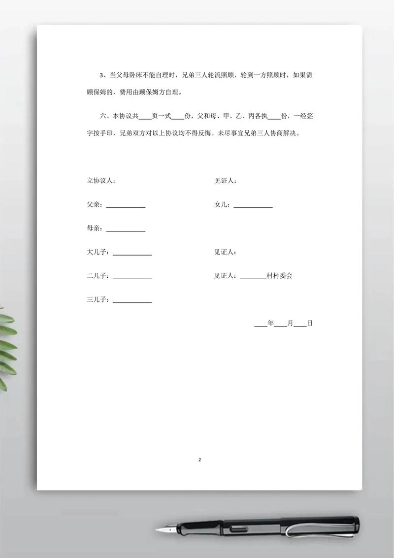 - 赡养义务必须对等:协议中可以约定赡养义务的分配(如哪个子女负责主要赡养,其他子女给予经济支持),但不能约定“谁分得多就由谁完全赡养,其他人一概不管”这样的条款,赡养父母是所有子女的法定义务,不能通过协议完全免除某个子女的赡养责任。