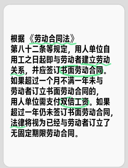 - 法律条文:《劳动合同法》第八十二条第一款规定:“用人单位自用工之日起超过一个月不满一年未与劳动者订立书面劳动合同的,应当向劳动者每月支付二倍的工资。”