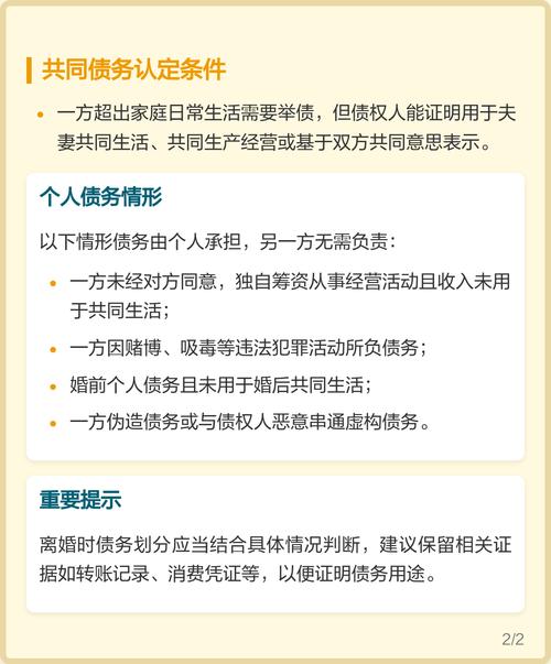 - 超出家庭日常生活需要:夫妻一方在婚姻关系存续期间以个人名义超出家庭日常生活需要所负的债务,不属于夫妻共同债务;债权人能够证明该债务用于夫妻共同生活、共同生产经营或者基于夫妻双方共同意思表示的除外。