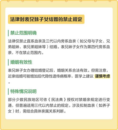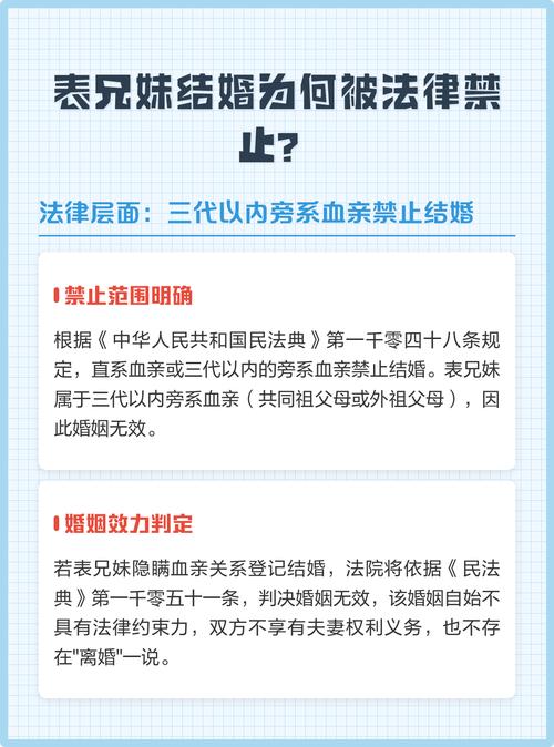 - 法律依据:《中华人民共和国民法典》第一千零四十八条规定:“直系血亲或者三代以内的旁系血亲禁止结婚。”