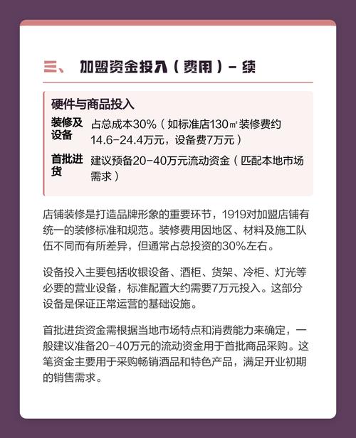 - 装修和设备投入: 1919对门店有统一的形象要求,装修和设备采购费用非常高,通常需要几十万甚至上百万,这笔钱大部分是加盟商自己承担。