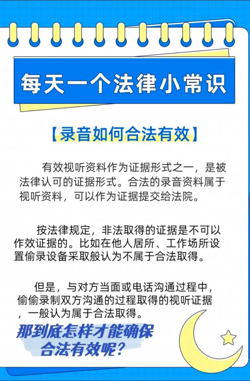 - 合法的情况:在公开场合、自己家中、与对方进行正常商业谈判或民间借贷沟通时进行的录音,只要不侵犯对方的隐私权,通常是合法的。