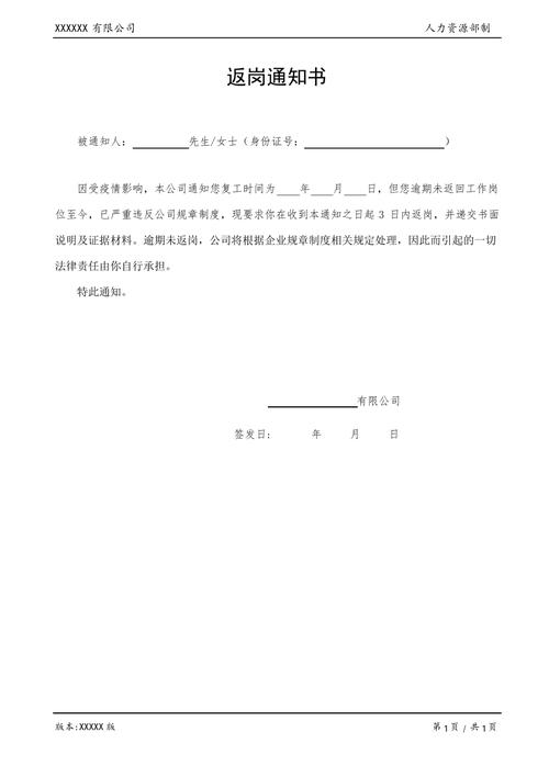- 证明公司已履行通知义务:公司需要证明自己已经明确、合理地通知员工返岗,一份规范的返岗通知书(最好通过EMS邮寄并保留好底单和签收记录,或通过公司内部系统发送并保留记录)可以证明: