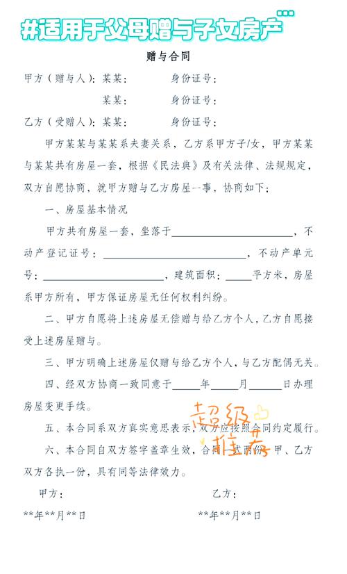 - 受赠人:同样需要具备完全民事行为能力,能够独立接受赠与并承担相应责任,如果受赠人是未成年人,其法定代理人(通常是父母)可以代为接受,但协议本身仍需明确。