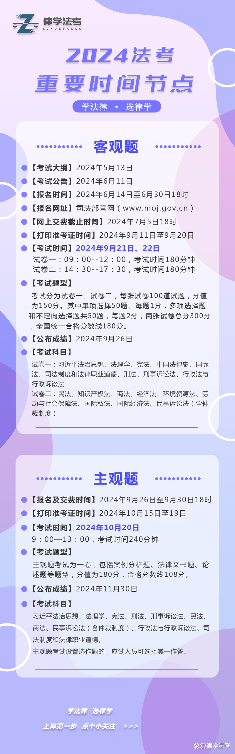 - 客观题成绩: 一般在9月下旬公布,通过客观题考试的人员,可在成绩公布后,在规定时间内登录司法部官网确认参加主观题考试。