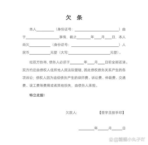 最后提醒: 欠条是重要的法律文件,在签署前,双方应仔细阅读所有条款,确保完全理解其含义,如有疑问,可咨询专业律师,对于大额借款,建议通过银行转账方式支付,并保留好转账凭证,转账时备注“借款”,以形成完整的证据链。