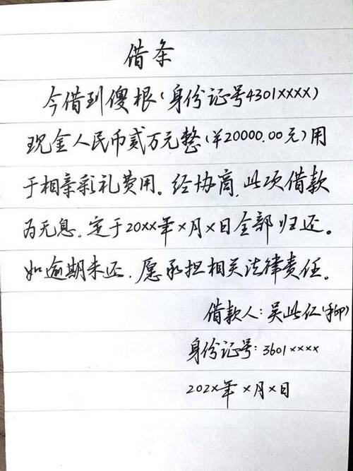借条怎么写才具法律效力? 下面我将为您详细拆解,并提供一个可以直接套用的模板和注意事项,核心构成要素(缺一不可)一份有效的借条,必须包含以下几个部分,才能在发生纠纷时被法院认可:明确文件性质**在纸张最上方正中央写上“借条”或“借款合同”字样,字体可以稍大,以示醒目,避免写成“收条”或“欠条”,三者法律含义不同,借款人信息:...