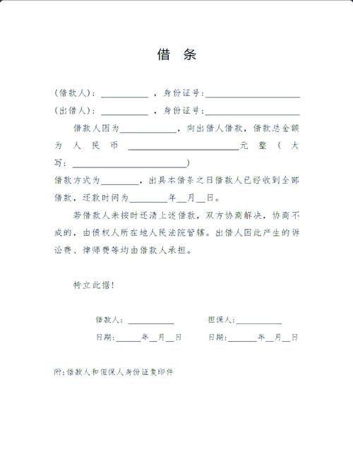 欠条怎样写才具有法律效力? 欠条的核心构成要素(必须包含)一份具备法律效力的欠条,必须明确以下几个关键要素,缺一不可:**明确写上“欠条”或“借条”字样,标题要醒目,放在最上方居中位置,注意:“借条”和“欠条”在法律上略有不同,借条通常直接证明借贷关系,而欠条可能源于多种原因(如买卖、服务费等),如果是借钱,最好用“借条”,双...