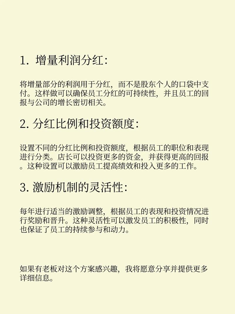 员工投资分红制度如何确保公平与激励? 公司员工投资分红管理制度(草案)第一章 总则第一条 目的与意义为建立、健全公司的长效激励机制,使员工与公司形成利益共享、风险共担的共同体,充分调动员工的积极性、主动性和创造性,吸引和保留核心人才,促进公司持续、健康、稳定发展,特制定本制度,第二条 基本原则激励与约束相结合原则:分红不仅是对过去贡献的...