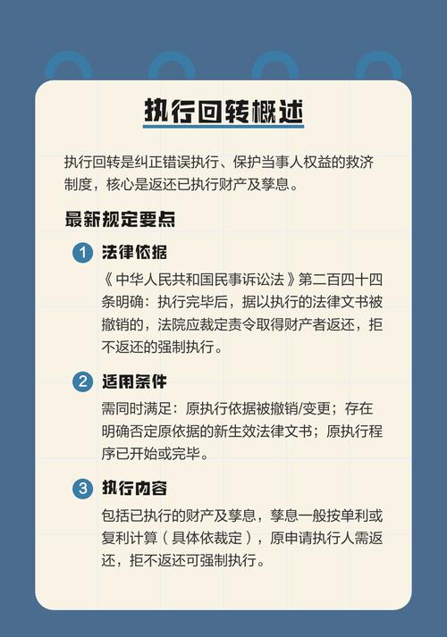 执行回转新规有哪些关键变化? “执行回转”是一个法律术语,通俗地讲,就是法院把已经执行到位的财产,再“还”回去,这通常发生在原来的判决被撤销、变更或者被认定为错误之后,为了纠正错误执行,保护当事人的合法权益而设立的一种补救制度,关于执行回转,最核心、最新的法律依据是《中华人民共和国民事诉讼法》(2021年修正)以及相关的司法解释...