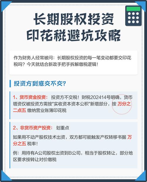 长期股权投资要交印花税吗?税率多少? 关于长期股权投资的印花税问题,主要涉及两个环节:取得环节(投资/受让)和持有/处置环节,在中国现行的税收法规下,长期股权投资本身(作为一项资产)并不需要缴纳印花税,但与其相关的法律文件(如股权转让合同)和资本变动(如实收资本增加)则需要缴纳印花税,以下是详细的分类解析:取得长期股权投资时(涉及合同)...