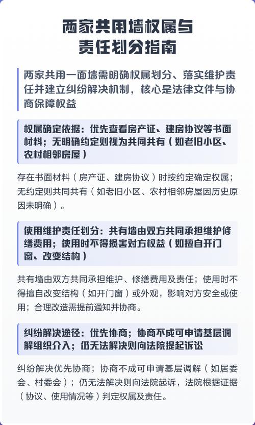 共用墙法律归属如何界定? 核心法律依据《中华人民共和国民法典》第二百八十八条:处理相邻关系,应当遵循有利生产、方便生活、团结互助、公平合理的原则,第二百八十九条:建造建筑物,不得违反国家有关工程建设标准,妨碍相邻建筑物的通风、采光和日照,第二百九十条至第三百零六条:这些条款详细规定了用水、排水、通行、通风、采光、噪音、安全等...
