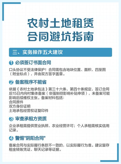 农村土地租赁有哪些法律规定? 农村土地的所有权归集体所有,农户享有承包经营权,土地流转(包括租赁)必须在坚持土地集体所有、不改变土地农业用途、保护农民合法权益的前提下进行,下面我将从不同类型的土地、租赁主体、主要规定、合同要点和风险防范等方面进行详细说明, 农村土地的主要类型及其租赁规定中国的农村土地主要分为三大类,它们的租赁规...