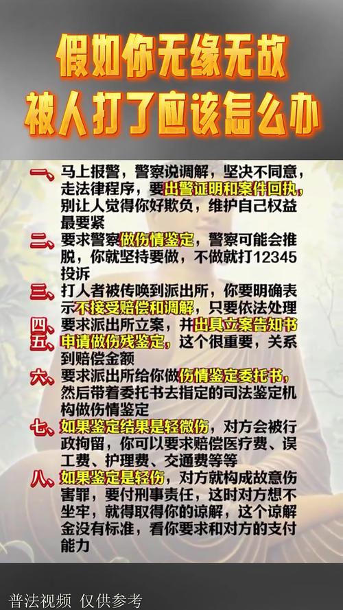 无缘无故被打,法律如何维权? 非常理解您此刻的愤怒、委屈和无助,无缘无故被打,这在法律上被称为“故意伤害”或“寻衅滋事”,是明确的违法行为,您完全有权利拿起法律武器保护自己,以下为您梳理了相关的法律知识和应对步骤,希望能帮助您理清思路,妥善处理,第一部分:核心法律知识(对方可能触犯的罪名)根据您被打的情节严重程度,对方的行为可能...