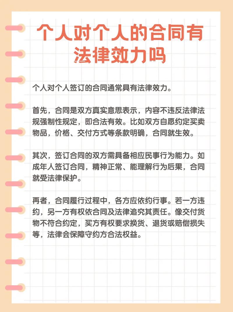 个人合同有法律效力吗 这是一个非常常见且重要的问题,答案是:个人合同在符合法律规定的条件下,是具有法律效力的,“个人合同”并不是一个法律术语,它通常指的是由自然人之间,而非公司或组织之间签订的合同,个人之间的房屋租赁合同、借款合同、买卖合同、服务合同等,要判断一份个人合同是否有效,需要看它是否满足法律规定的以下几个核心要...