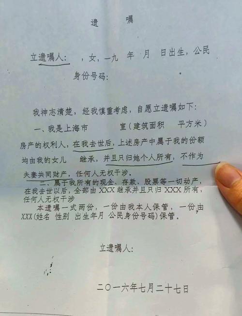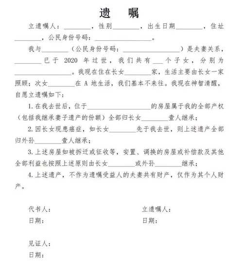 老人遗嘱如何写才具法律效力? 形式合法是第一要务根据中国《民法典》,遗嘱有几种法定的形式,无论内容多好,只要形式不合法,遗嘱就是无效的,对于普通家庭,最推荐、最不容易出错的是公证遗嘱和自书遗嘱, 遗嘱的法定形式(选择最适合的一种)公证遗嘱 (最推荐,效力最强)这是最稳妥、最不容易产生争议的方式,如何操作:准备材料:老人的身份证、...