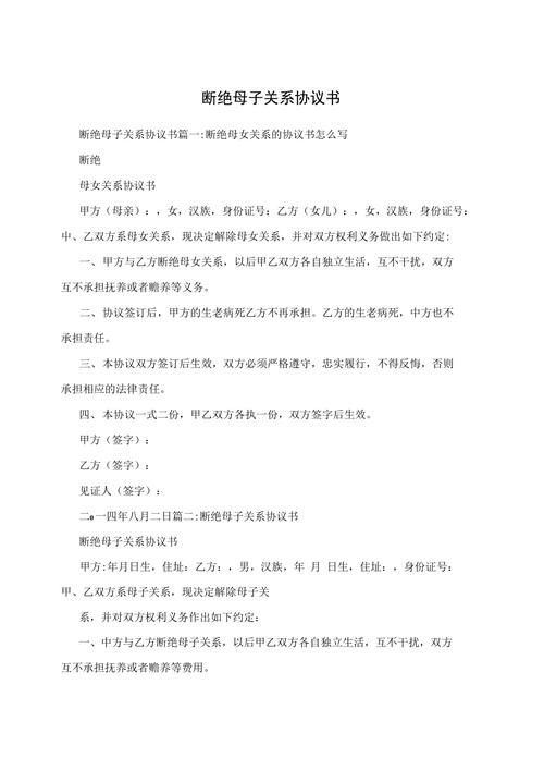 断绝母子关系需走哪些法律程序? 这是一个非常重要且严肃的问题,需要明确一个核心法律概念:在中国大陆的法律体系中,没有“断绝母子关系”这一法律程序,法律上的亲属关系是基于血缘(自然血亲)或法律拟制(如收养)而产生的,这种关系是法定的、永久的、不能通过协议或单方面声明来解除的,无论是《民法典》还是其他任何法律,都没有规定父母与子女可以...